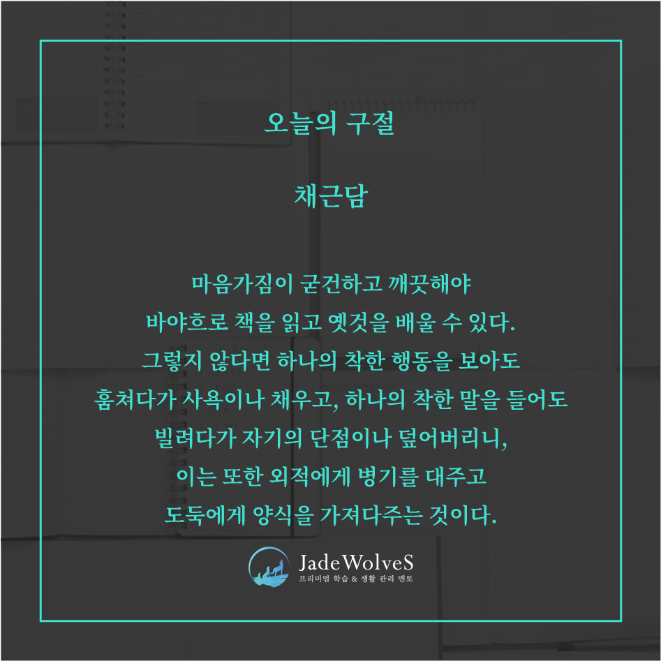 '골목식당'의 식당 사장들과 예산시장 상인들의 공통점은 개선과 발전을 위한 변화의 문턱을 넘지 못했다는 점입니다. 변화는 힘들고 어렵습니다. 그만큼 마음가짐도 준비가 되어야 온전히 받아들일 수 있습니다. 힘든 일은 피하면서 이익을 기대하다 보니 다시 예전으로 돌아가는 것입니다. 오늘 소개된 채근담의 한 구절은 우리에게 마음가짐의 중요성을 일깨워 줍니다.