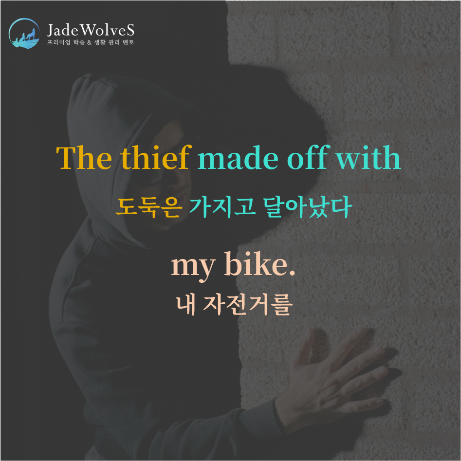 2) make off with: "함께 떨어지게 시키다"라고 해서 "가지고 달아나다"라는 의미로 사용됩니다.