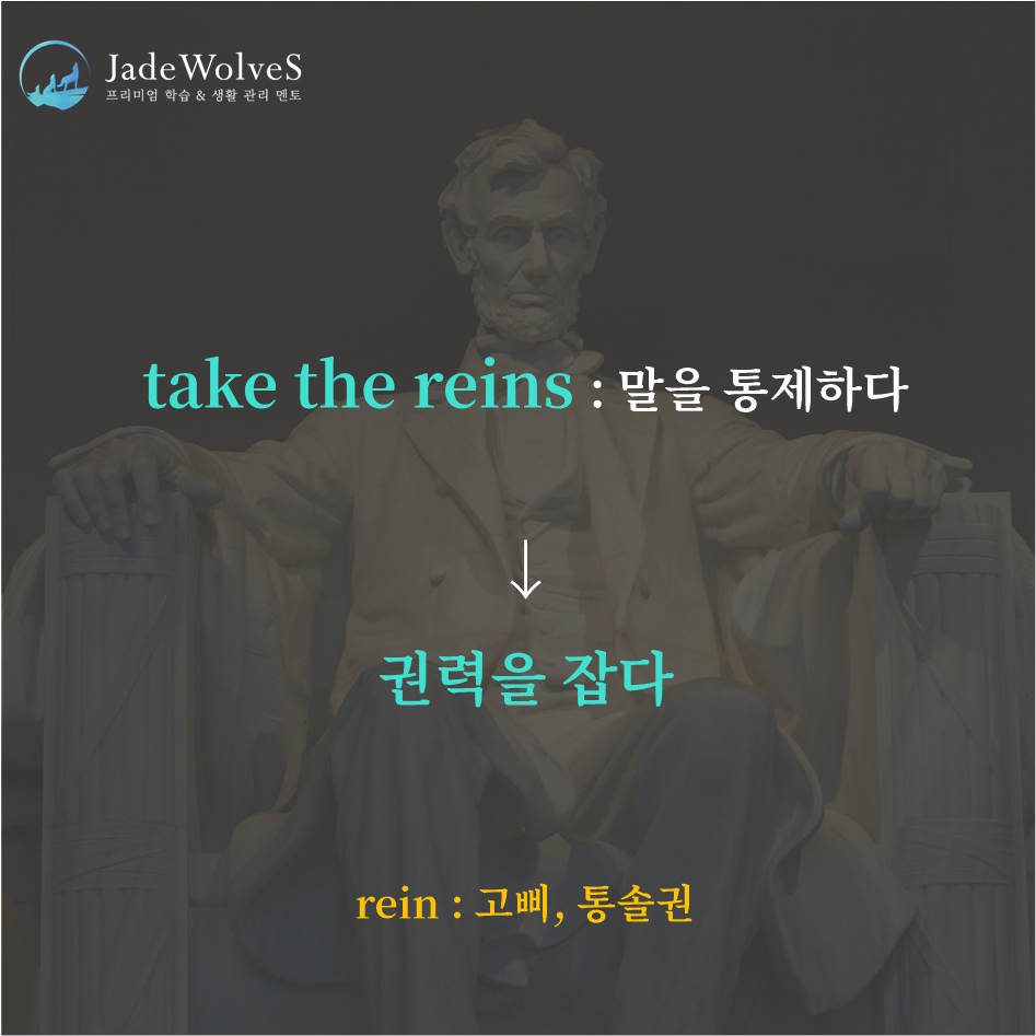 1) take the reins : "말을 통제하다"라고 해서 "권력을 잡다"라는 의미로 사용됩니다.
