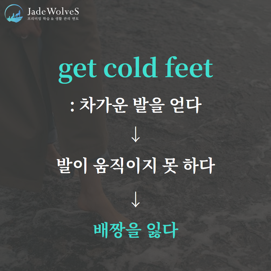 2) get cold feet : "차가운 발을 얻다, 발이 움직이지 못하다"라고 해서 "배짱을 잃다"라는 의미로 사용됩니다.