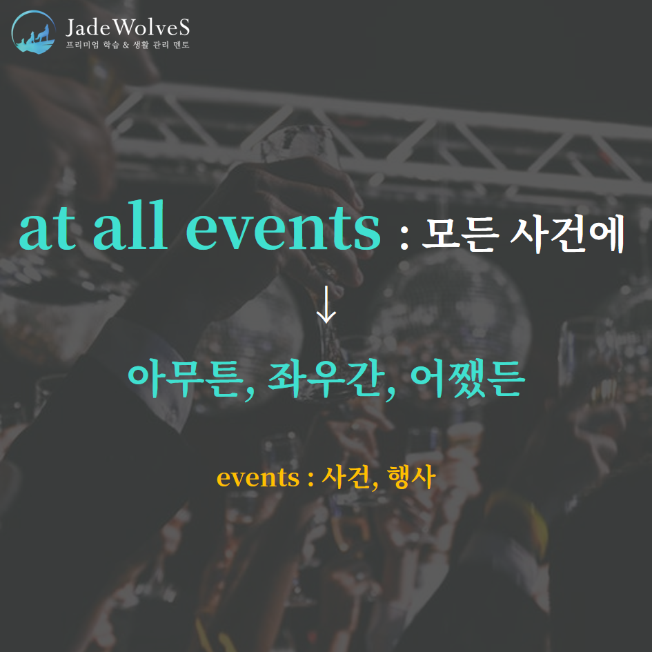 2) at all events : "모든 사건에"라고 해서 "아무튼, 좌우간, 어쨌든"이라는 의미로 사용됩니다.