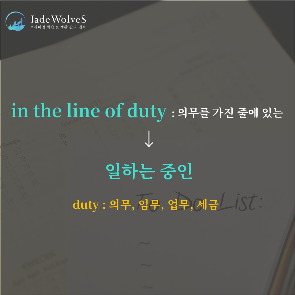 2) in the line of duty : "의무를 가진 줄에 있는"이라고 해서 "일하는 중인"이라는 의미로 사용됩니다.