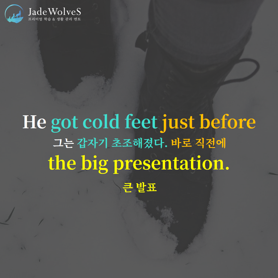 2) get cold feet : "차가운 발이 되다"라고 해서 "갑자기 초조해지다"라는 의미로 사용됩니다.