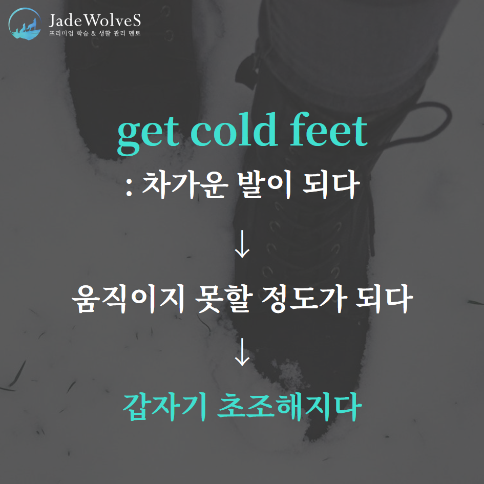 2) get cold feet : "차가운 발이 되다"라고 해서 "갑자기 초조해지다"라는 의미로 사용됩니다.