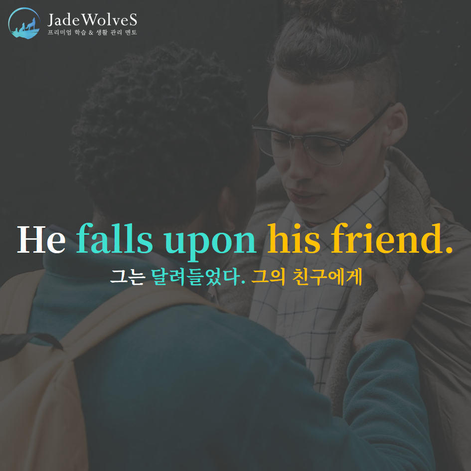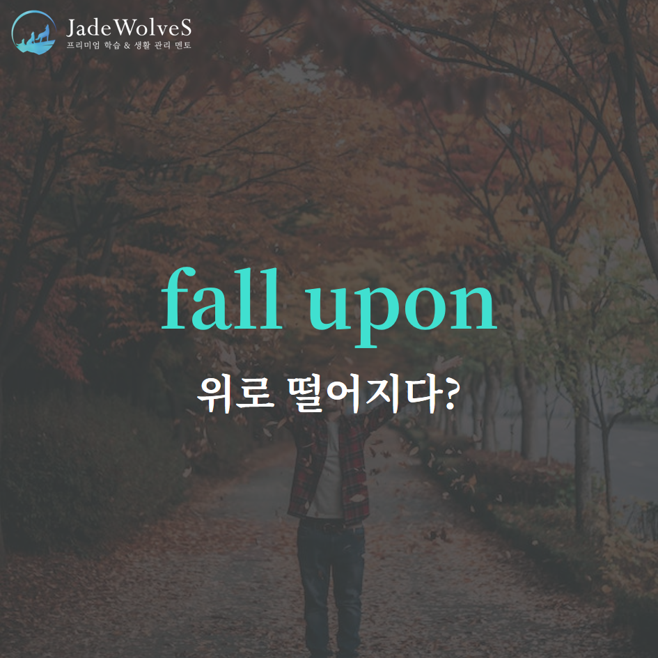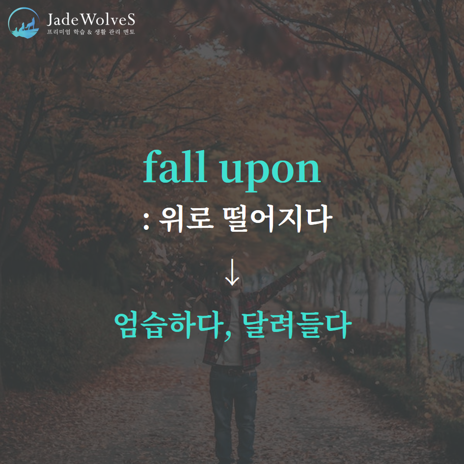 1) fall upon : "위로 떨어지다"라고 해서 "엄습하다, 달려들다"라는 의미로 사용됩니다.