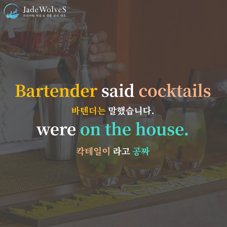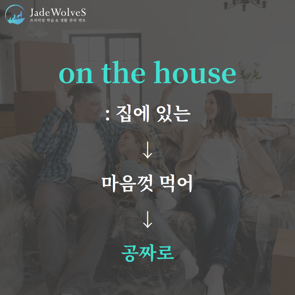 2) on the house: "집에 있는, 마음껏 먹어"라고 해서 "공짜로"라는 의미로 사용됩니다.