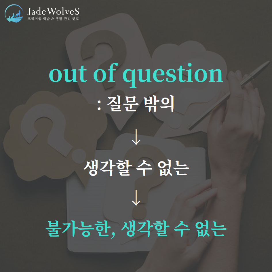 1) out of question : "질문 밖의"라고 해서 "불가능한, 생각할 수 없는"이라는 의미로 사용됩니다.