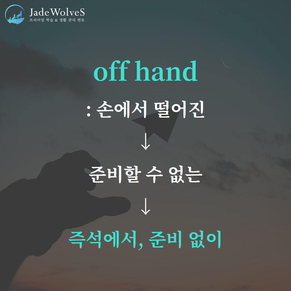 1) off hand : "손에서 떨어진"이라고 해서 "즉석에서, 준비 없이"라는 의미로 사용됩니다.