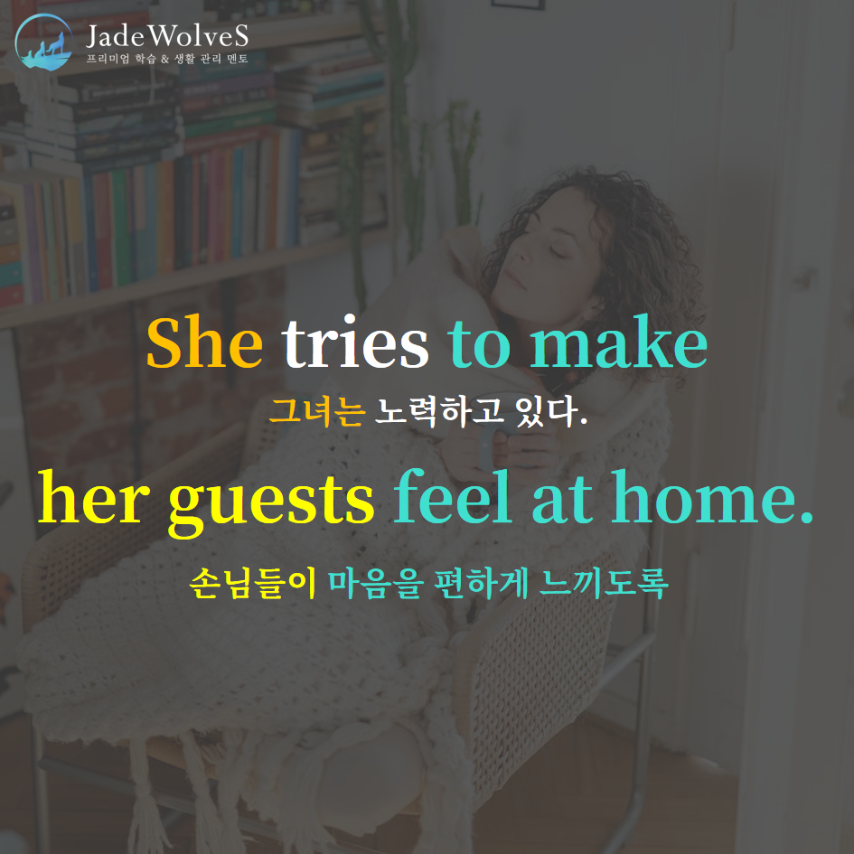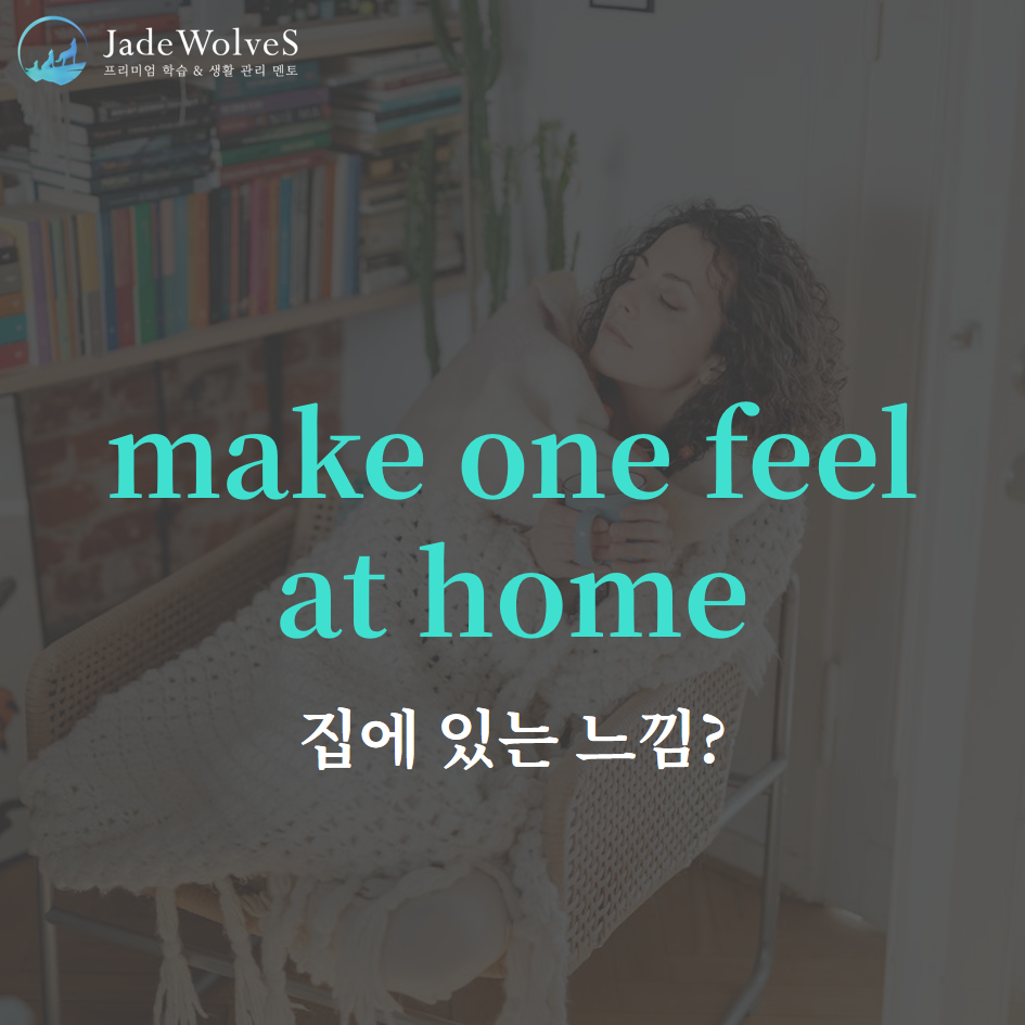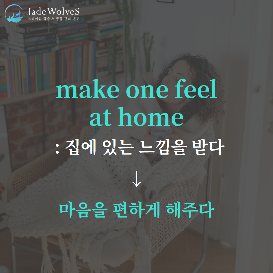 2) make one feel at home : "집에 있는 느낌을 받다"라고 해서 "마음을 편하게 해주다"라는 의미로 사용됩니다.