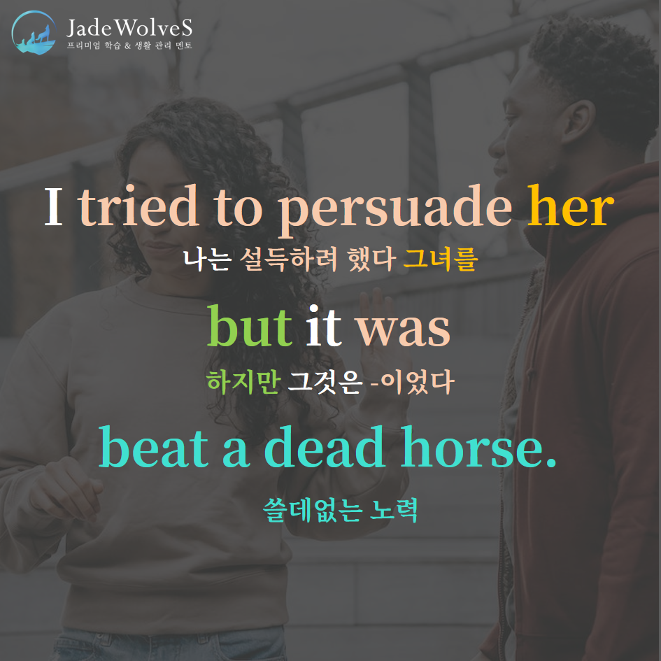 2) beat a dead horse : "죽을 말을 때리니까"라고 해서 "쓸데없는 노력을 하다"라는 의미로 사용됩니다.