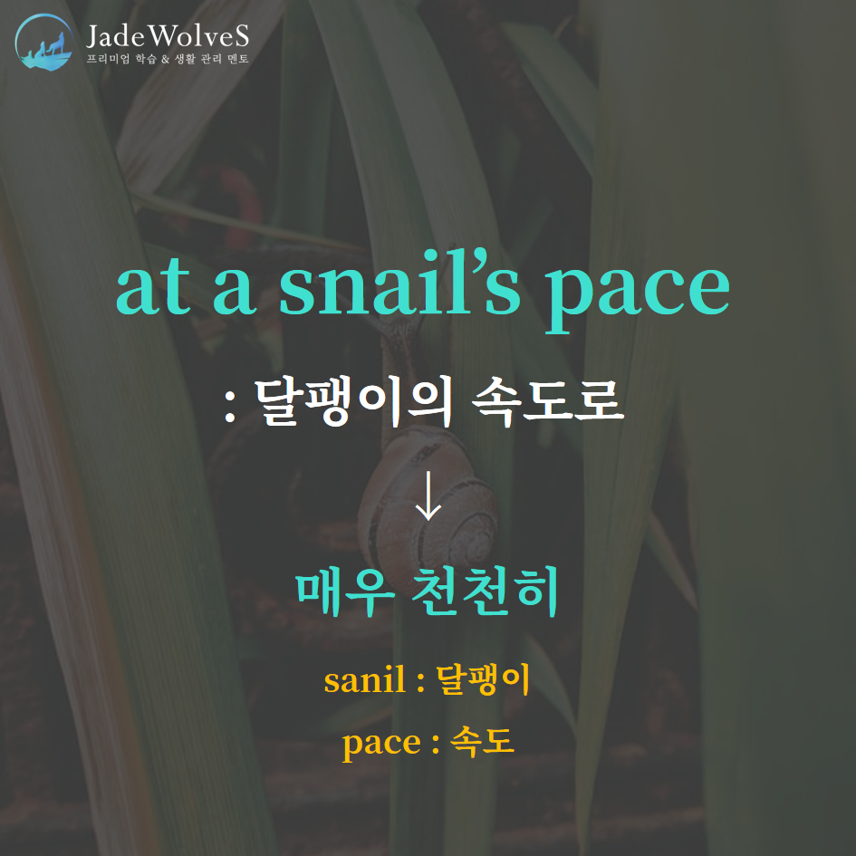 2) at a snail's pace: "달팽이의 속도로"라고 해서 "매우 천천히"라는 의미로 사용됩니다.