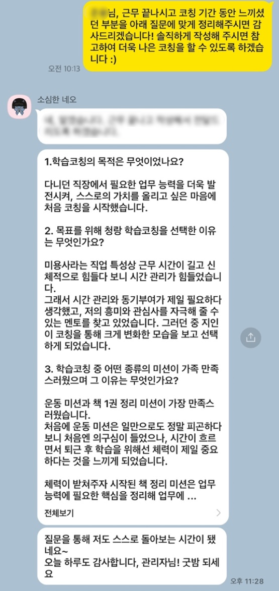 그래서 시간 관리와 동기부여가 제일 필요하다 생각했고, 저의 흥미와 관심사를 자극해 줄 수 있는 멘토를 찾고 있었습니다. 그러던 중 지인이 코칭을 통해 크게 변화한 모습을 보고 선택하게 되었습니다.
