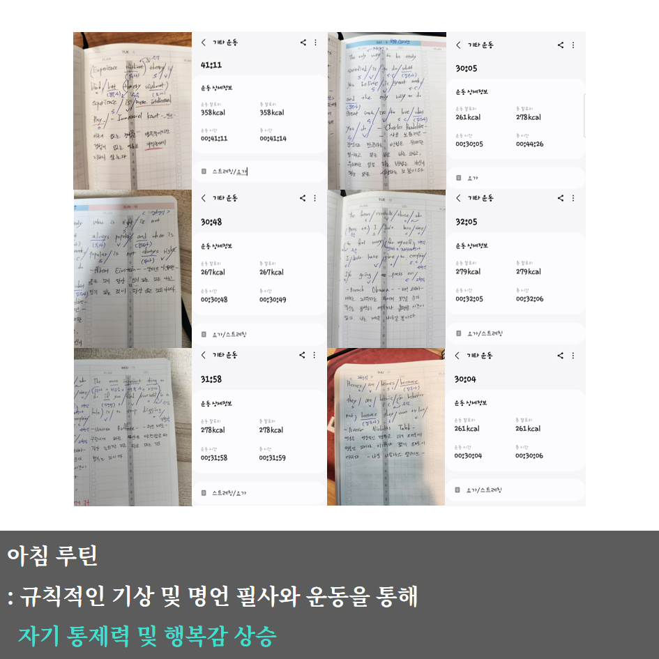 집중력 향상과 스트레스 완화를 위해 명언 필사와 아침 운동(요가) 미션을 제안했습니다.