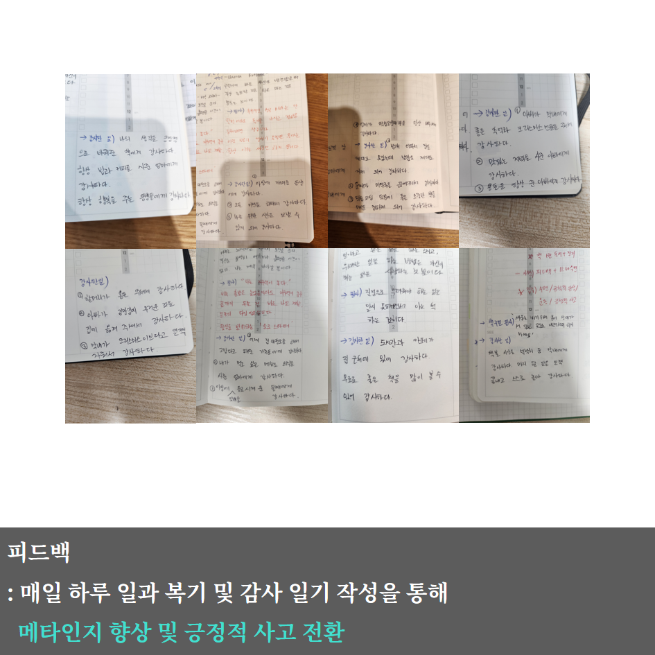 마지막으로 메타인지 향상과 긍정적 사고 전환을 위해 피드백 미션을 제안했습니다.