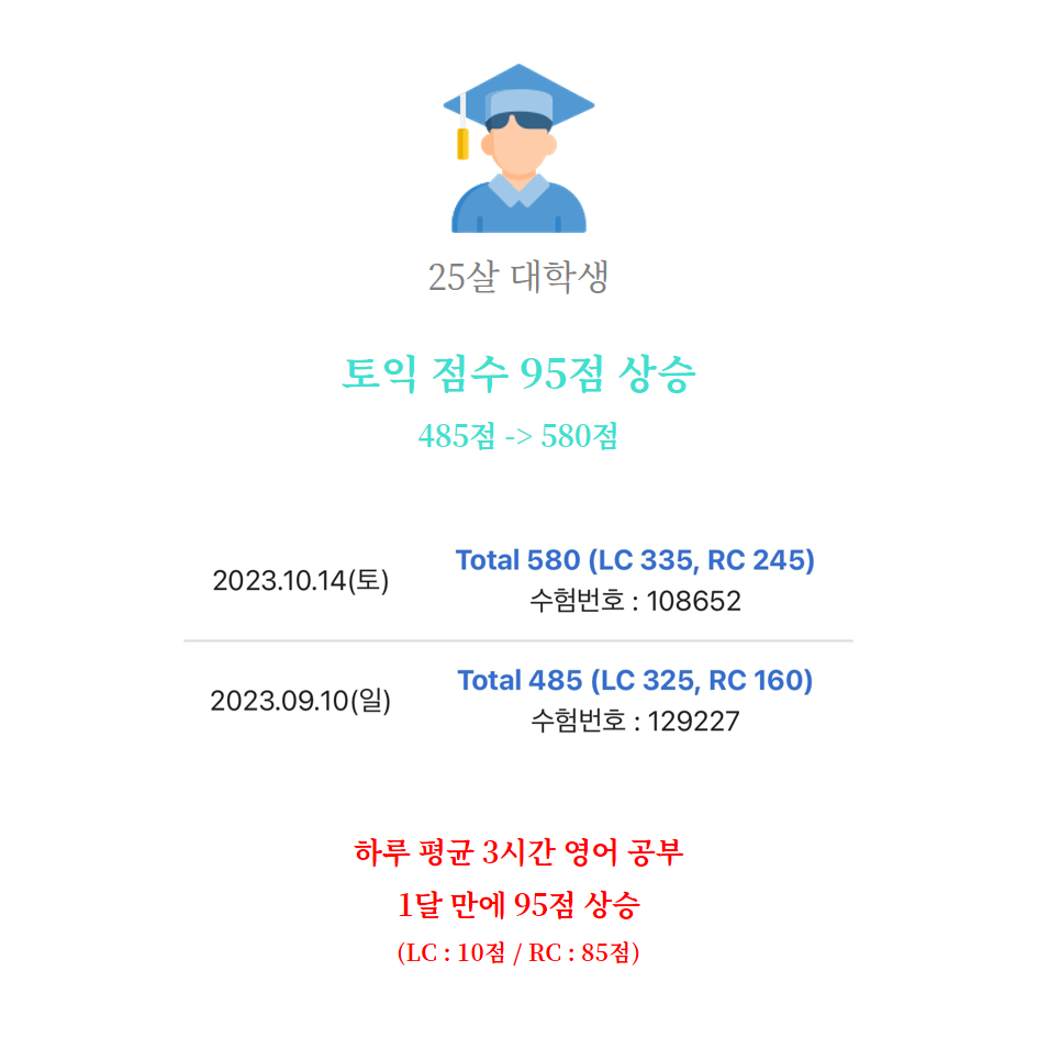 편입을 위해 현재 공인 영어 점수의 준비가 필요한 상황이었습니다. 코칭 시작 당시 토익 점수는 300점 초반으로 기본기가 굉장히 부족한 상태였습니다. 우선 가장 고득점 하기 쉬운 토익 시험을