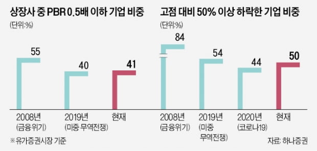 위의 표를 보면 증시가 바닥에 근접했다는 사실을 수치로 나타내고 있다. 경제 위기가 왔을 때만큼 저점이라는 것을 보여준다. 그렇다고 주식이 싸다고 말할 증거는 없다. 그러나 PBR(주가/주당 순자산가치)이 0.5 미만인 기업이 41%나 된다고 하나증권이 발표했다. 기업의 재무 상태를 보고 주가를 판단하는 지표가 PBR이다. PBR 값의 1을 기준으로 1보다 낮으면 저평가, 1보다 높으면 고평가라 생각하면 된다. 다시 말해서 0.5 미만은 매우 저평가된 것이다.