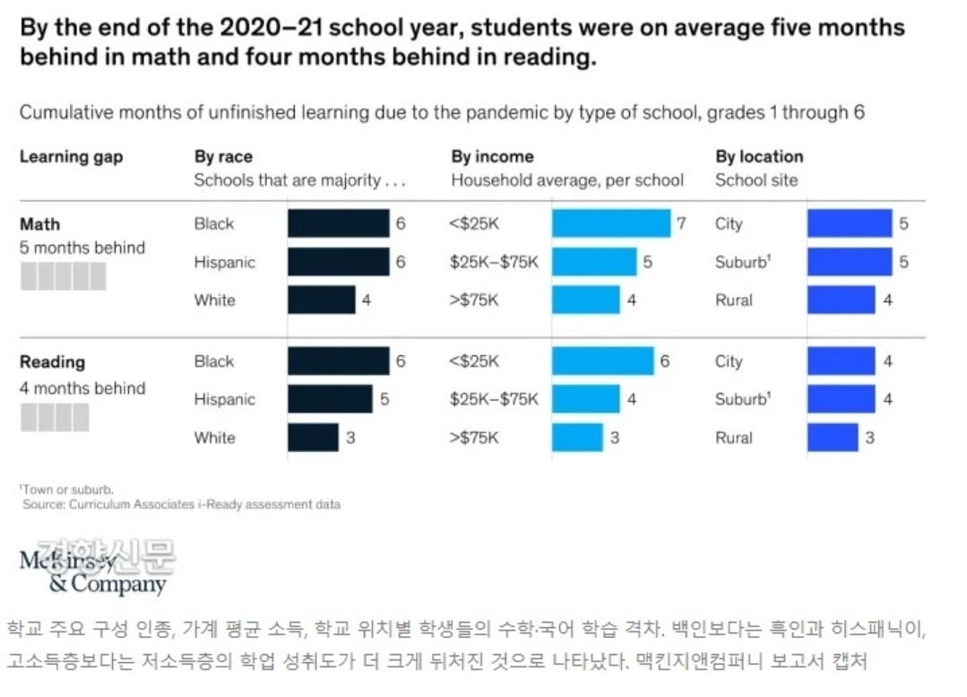 미국에서 아시아계 인종이 월등한 학업 성취를 보여주는 것으로 알려져 있다. 미국인들은 아시아계가 똑똑하게 태어났고 수학과 과학도 잘한다고 생각한다. 하지만 인종에 따라 학업 성취도에서 차이를 보인다는 생각은 편견일 뿐이다. 학습 성과의 차이는 인종이 아니라 부모가 가진 경제력에 따라 차이를 보인다는 게 전문가들의 지적이다. 경제력이 학습의 차이를 만든다는 사실을 아래 도표가 보여준다. 그러나 인종에 따른 학습 성과 차이는 확인 할 수 없다.