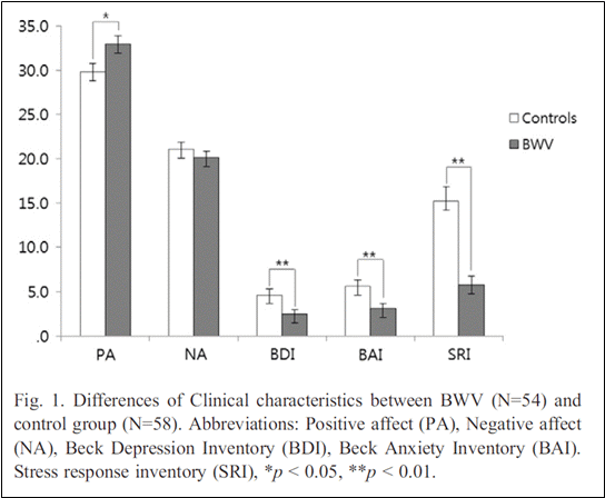 일반인(Controls)와 명상수행자(BWV)의 긍정(PA), 부정(NA), 우울증(BDI), 불안(BAI), 스트레스 반응(SRI) 차이 연구 결과 [출처 : 브레인미디어]