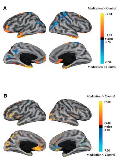 일반인(A)과 명상 수행자(B)의 피질 두께 [출처 : 브레인미디어]