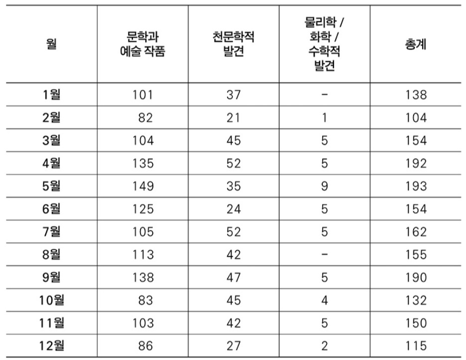 '미쳤거나 천재거나'의 저자 체자레 룸브로조는 천재들이 일반인들보다 온도에 더욱 민감하다고 지적한다. 유럽 지역 한정이어서 통계로 유추하는 데 한계가 있을 수 있다. 천재들의 업적이 나오는 시기를 정리한 자료가 위 도표에 있다. 도표에서 보여주는 것은 4, 5, 9월에 천재들이 문학, 예술, 천문학, 수학, 과학 등 다양한 분야에서 인류 발전에 이바지하는 업적을 냈다는 사실이다.앞서 업무 효율에 가장 적합한 섭씨 21도가 바로 3개의 달 안에 평균적으로 측정되는 온도이다. 일반인에게 효율이 높은 온도는 천재들에게도 엄청난 효율을 내게 하는 것 같다. 특히 추운 겨울에 접어들면 190개 정도의 업적이 120개 미만으로 줄어든다. 천재들의 큰 업적이 추위 때문에 급격히 줄어든다는 것은 결국 추위가 문명 발전을 더디게 만드는 셈이 된다.