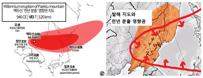 고구려 멸망 후 대조영이 고토(古土) 회복을 주창하며 세웠던 발해. 고구려의 정신을 물려받아 만주를 기반으로 해동성국(海東盛國)이라 불렸지만, 거란족(契丹族)이 세운 요(遼)나라에 의해 20일 만에 멸망했다. 역사학자들은 발해 멸망 원인을 지배층 계급에서 밀려나 불만이 쌓인 말갈족(靺鞨族)이 요나라의 공격과 함께 반란을 일으켜 단기간에 발해가 망했다는 설에 무게를 두고 있다. 당시 발해의 군사력이 과연 요나라에 20일 만에 멸망할 만큼 약했을까? 물론 사료(史料)가 부족하여 구체적으로 논증하는 데는 한계가 있다. 그런데 백두산(白頭山) 폭발을 제기하며 발해가 혼란에 빠져 멸망했을 것이라는 과학적 가설도 있다. 특히 10세기 폭발한 백두산의 화산재를 일본 홋카이도에서 발견한 일본 학자들은 이 정도 폭발 규모라면 한 국가를 패닉 상태로 끌고 갈 수 있다고 지적했다. 로마의 폼페이가 화산재에 묻혀 잊히듯이 백두산 근처에 발해의 중심도시인 5경(京)이 모여있었기에 상당한 설득력이 있는 것 같다.