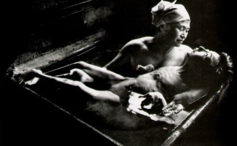 이타이이타이 병에 걸린 자식을 씻기는 엄마. 이 사진으로 전세계 언론에 알려지며 일본 4대 공해병이라 알려짐