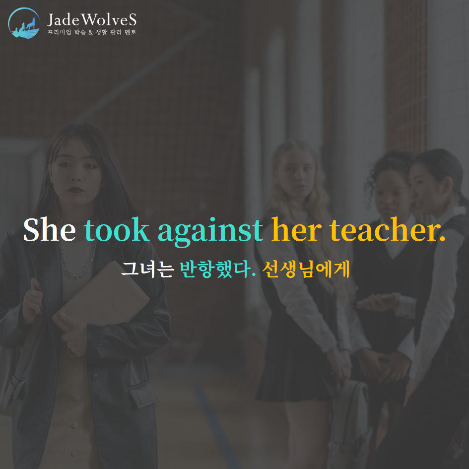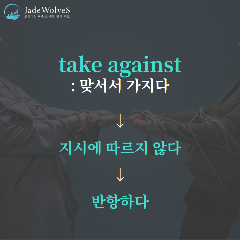 2) take against : "맞서서 가지다"라고 해서 "반항하다"라는 의미로 사용됩니다.