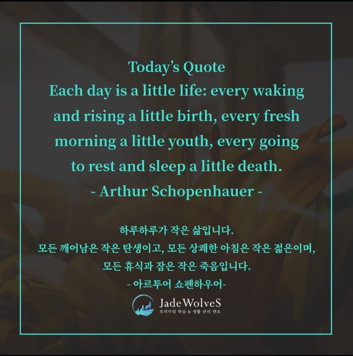 아르투어 쇼펜하우어는 독일 출신의 철학자이다. 유년 시절 그는 유복한 상인 집안에서 태어났으나 부모 사이가 좋지 않았다. 뒷날 아버지가 자살하고 어머니는 사교에 빠지자, 성년이 된 그는 어머니에게 소송을 걸어 큰 재산을 상속받아 평생 편하게 살았다. 그는 당대의 위대한 철학자 헤겔의 사상에도 신랄한 비판을 하며 허무주의를 강조했다. 모든 인간은 부단한 욕망을 좇기에 고통에 휩싸인다며 욕망을 좇지 말 것을 강조했다. 그의 주장은 불교의 교리와도 일치해서 서양에 동양 사상을 알린 최초의 학자이기도 하다. 그의 말처럼 순간순간에 최선을 다하는 삶이 가장 완벽한 삶이라 여겼듯이 매 순간을 마지막처럼 최선을 다해야 할 것이다.