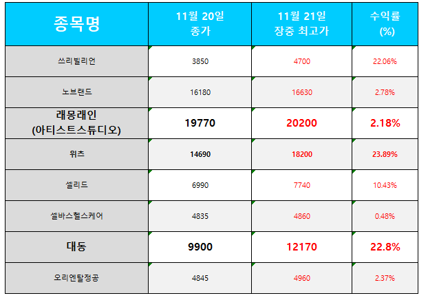 | 오늘의 관심 종목(2024.11.22) (0) | 2024.11.22 |