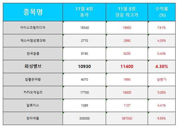 오늘의 관심 종목 수익률(2024.11.05)
