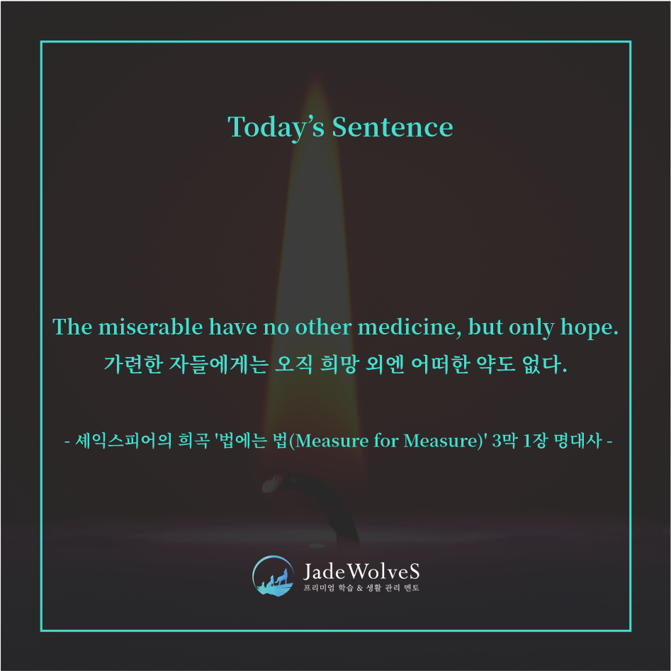 셰익스피어의 희곡 Measure for Measure(국내에선 「십계」 혹은 「법에는 법」으로 알려짐) 3막 1장에 나오는 명대사 입니다. 고통과 시련에 빠진 인간이 결국 붙잡을 것은 희망뿐이라는 의미로 읽힙니다.
