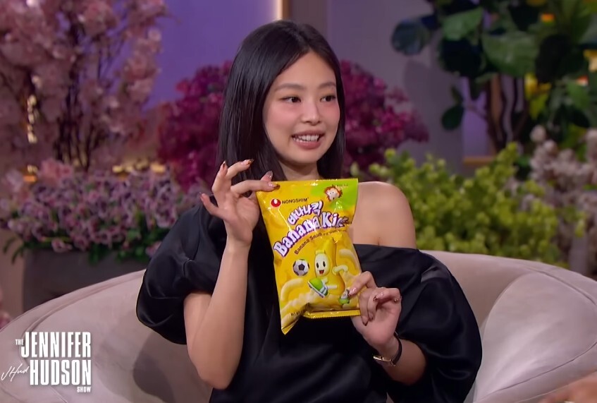 미국의 토크쇼 ‘제니퍼 허드슨쇼’에 출연해 농심의 바나나킥을 소개하는 블랙핑크 제니. 유튜브 채널 ‘Jennifer Hudson Show’ 캡처