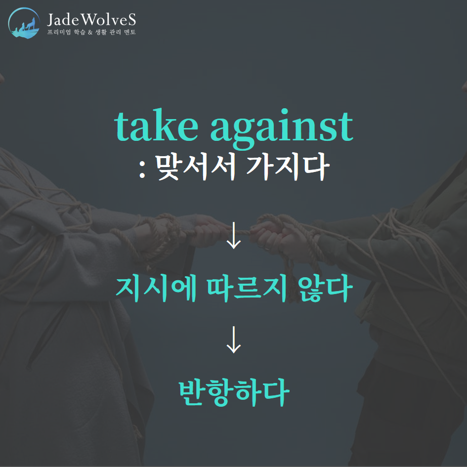 1) take against : "맞서서 가지다"라고 해서 "반항하다"라는 의미로 사용됩니다.