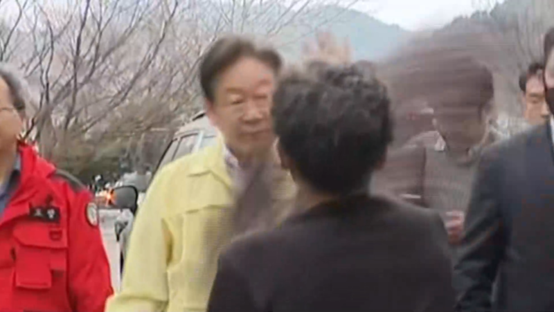 이재명 더불어 민주당 대표가 경북 영양 산불 피해 이재민 대피소를 찾아 산불 피해 상황을 살폈습니다. 대피소 건물 밖으로 나온 이 대표는 자원봉사자들에게 인사하기 위해 외부 배식 차량으로 이동하며 주민들을 향해 손을 흔들었습니다. 이 과정에서 한 남성은 이 대표 쪽 지나가다 겉옷을 휘둘렀습니다. 겉옷에 얼굴을 맞은 이 대표는 놀란 듯 그대로 서 있었고, 남성은 경호원들에게 제지당했습니다.