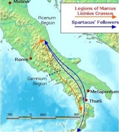 이 사건은 뜻밖에도 당시 로마 전역에 퍼져 있던 수많은 억압 받는 노예와 가난한 사람들의 호응을 얻어 대규모 반란으로 발전하게 됩니다. 이후 몇 달 만에 스파르타쿠스의 부대는 무려 12만 명이 넘는 거대한 노예군으로 불어났습니다. 그는 로마의 정규 군대를 여러 차례 격파하며 로마 본토를 위협하는 수준에 이르게 되었습니다. 로마는 심각한 위기를 맞이하였고, 결국 기원전 71년, 막대한 병력을 동원한 로마 장군 크라수스(Marcus Licinius Crassus)의 대군에 의해 스파르타쿠스 반란군은 진압되었으며, 이 전투 중 스파르타쿠스도 전사했습니다. 스파르타쿠스는 의도치 않게 로마가 정치적인 목적으로 만든 검투사 시합에 참가하며, 유명세를 얻어 로마 역사에 이름을 남기게 되었습니다.