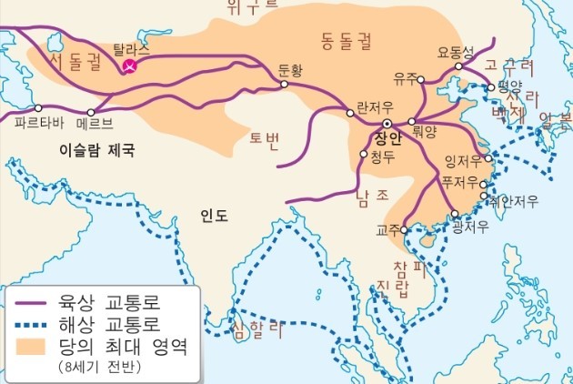 서역(西域, 현재의 신장 위구르 자치구 및 중앙아시아 지역)은 동서 문명이 교류하는 중요한 실크로드(Silk Road) 무역로였습니다. 당나라의 경제와 외교 전략에서 실크로드는 필수적인 교역로였으며, 이를 확보하면 경제적 이익뿐만 아니라 군사적 우위를 확보할 수 있다 판단했습니다. 7세기 당시 중앙아시아는 서돌궐(西突厥, 튀르크계 유목 국가)과 토번(吐蕃, 현재의 티베트)이 강력한 세력을 형성하고 있었습니다.
