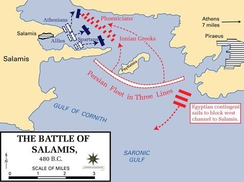 페르시아 황제 크세르크세스가 대군을 이끌고 그리스를 2차 육로와 해로를 통해 침공합니다. 테미스토클레스는 “육지에서 맞서면 밀릴 수밖에 없으니 협소한 해협으로 적 함대를 유인해 결정적 승리를 거둬야 한다”라고 주장했습니다. 아테네 함대의 주도적 역할과 테미스토클레스의 집요한 설득 끝에 그리스 주요 도시들은 살라미스 해협에서 전투에 참여합니다. 그리스 연합 함대는 거대 페르시아 함대를 좁은 해협으로 끌어들여 격파하는 대승리를 거둡니다. 테미스토클레스는 ‘아테네를 구한 구원자’로 찬양받게 됩니다. 살라미스 해전 이후 아테네는 영웅으로 떠오른 테미스토클레스를 극진히 대우했습니다. 그의 정치적 발언권이 커졌고, 그의 해군 중심 정책도 계속 추진되었습니다.