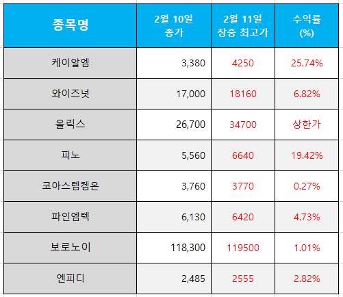 오늘의 관심 종목 수익률(2025.02.11)