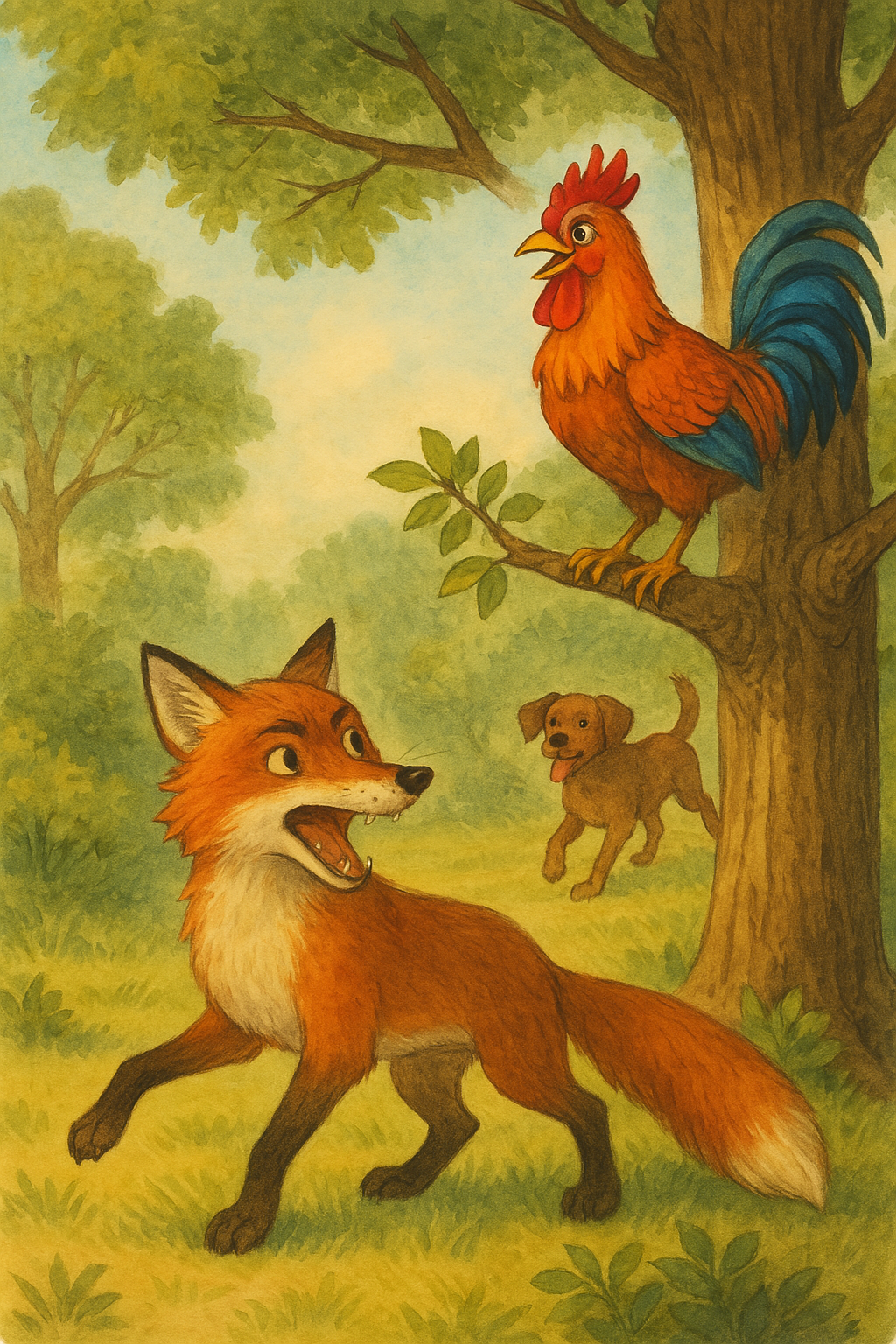 A cunning fox tries to lure a cock down from a tree by pretending to be friendly. The cock says, “Wait, let’s go together when the dog comes.” Hearing that, the fox runs away in fear. The story shows how quick thinking can defeat trickery.
