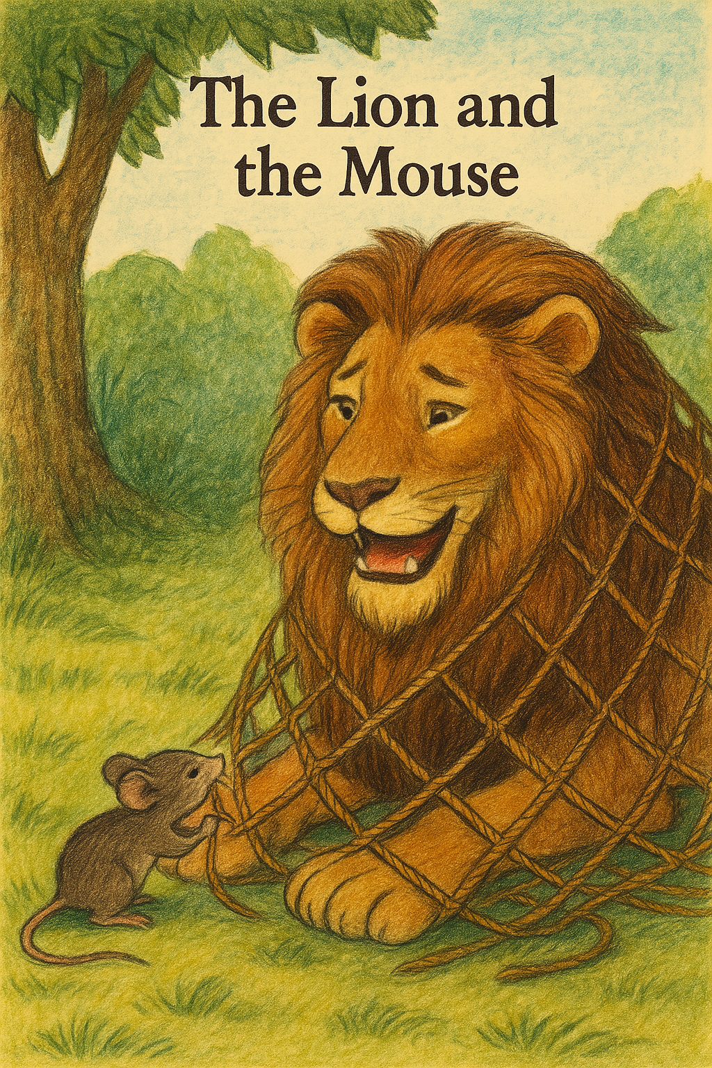 A big lion catches a little mouse. The mouse says, “Please let me go.” Later, the lion is in trouble. The mouse helps him and they become friends.
