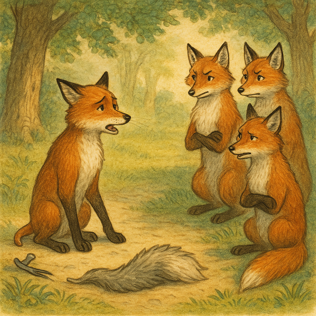 A fox lost his tail in a trap and felt embarrassed. He told other foxes that having no tail was better. But they didn’t believe him. They knew he only said that to feel better about himself.