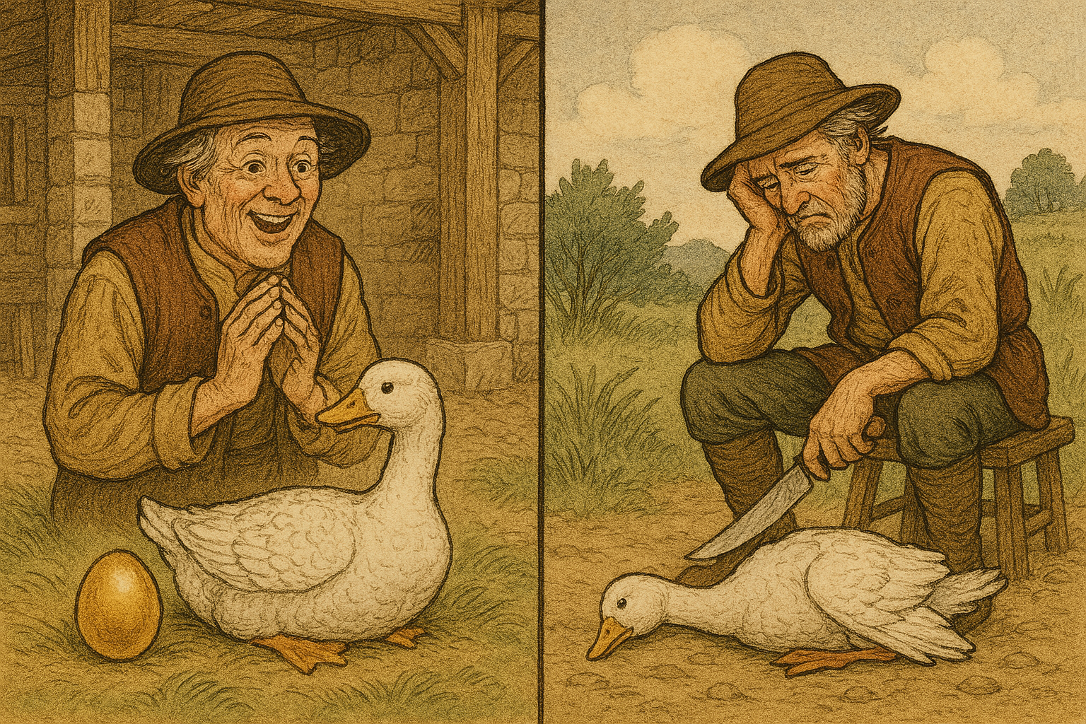 A farmer, blessed with a goose that laid a golden egg each day, grew increasingly greedy and dissatisfied with the slow accumulation of wealth. Hoping to obtain all the gold at once, he slaughtered the goose, believing it contained a hoard of treasure. To his dismay, he found nothing inside and realized he had destroyed the very source of his fortune.