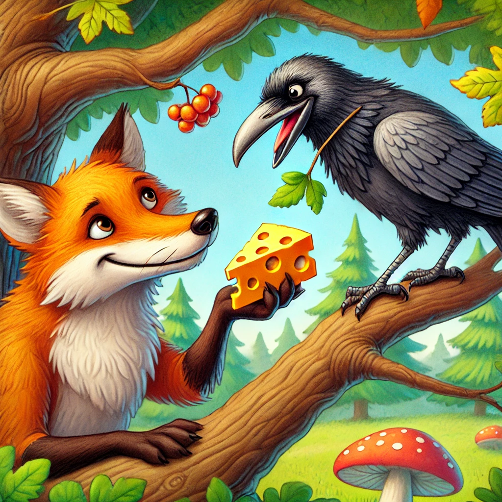 A crow finds a piece of cheese and perches in a tree to enjoy it. A cunning fox, eager to claim the cheese, flatters the crow by praising its beautiful voice. Wanting to impress the fox, the crow opens its beak to sing, unknowingly dropping the cheese. Seizing the opportunity, the fox swiftly snatches the cheese.