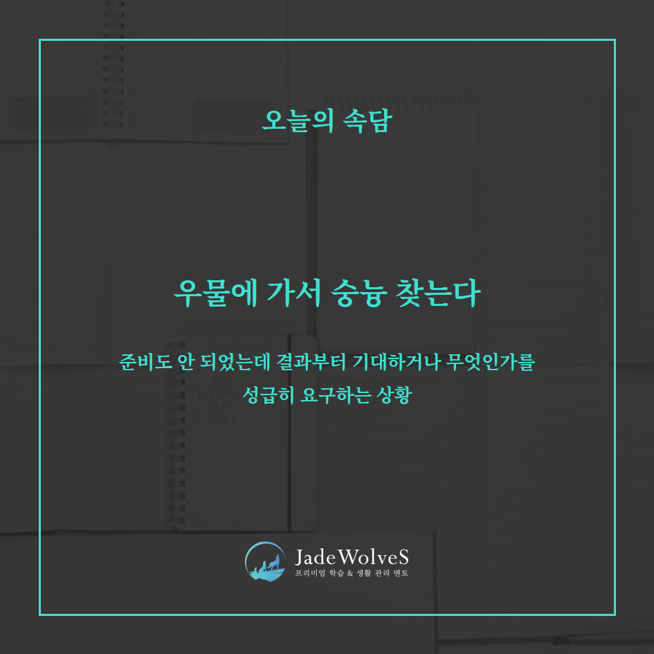 밥을 지어야 숭늉(뜨거운 누룽지 물)이 생기는데, 아직 물만 있는 우물에 가서 숭늉부터 찾으려 한다는 뜻입니다. 즉 준비도 안 되었는데 결과부터 기대하거나 무엇인가를 성급히 요구하는 상황을 가리킵니다. 옛 선조들은 가마솥에 쌀을 지어 밥을 한 뒤, 바닥에 눌어붙은 누룽지에 물을 부어 끓여 먹는 숭늉을 즐겼습니다. 그런데 우물에선 그저 찬물만 길어 올릴 수 있을 뿐인데도, 우물에 가서 숭늉을 찾는다라고 하면 준비도 없이 덥석 결과부터 바란다는 비유로 썼다는 설이 있습니다.