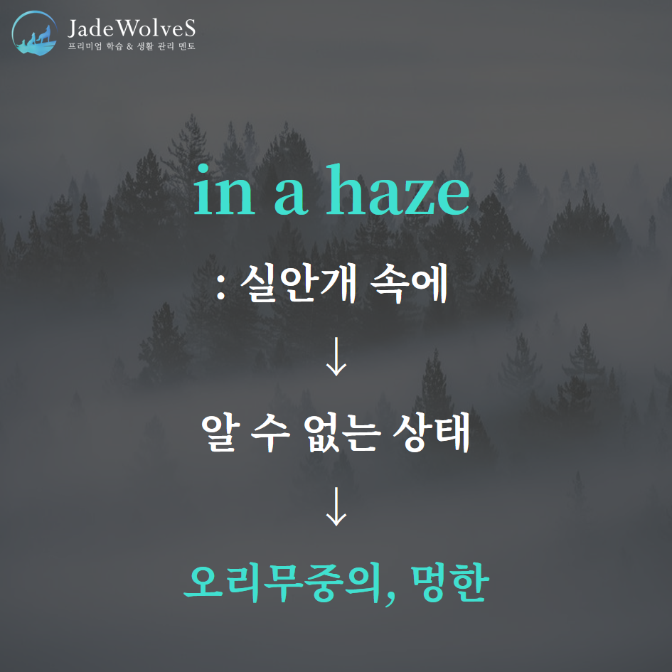 1) in a haze : "실안개 속에 - 알 수 없는"이라고 해서 "오리무중의"이라는 의미로 사용됩니다.