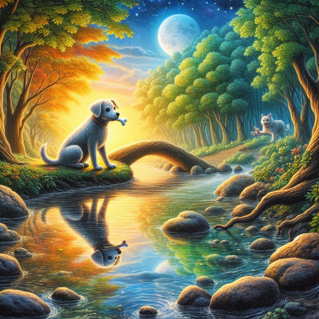 A hungry dog discovered a bone and gripped it firmly in his mouth.As he crossed a bridge over a river, he noticed his reflection in the water and mistook it for another dog holding a larger bone.Driven by greed, he barked in an attempt to seize the other bone, but in doing so, he let go of his own, which fell into the river and was lost.In the end, the dog’s selfish desire cost him everything, teaching him a valuable lesson about greed and contentment.