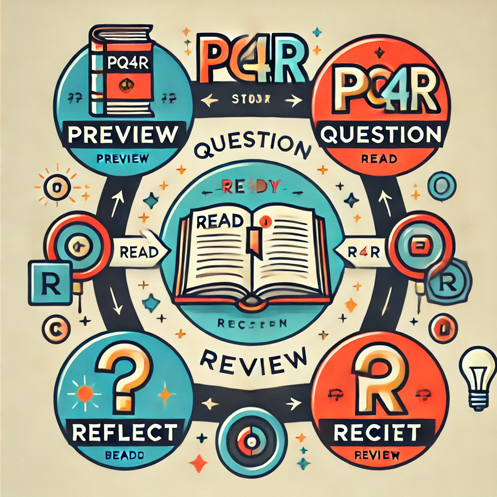 PQ4R은 “Preview(미리보기) → Question(질문하기) → Read(읽기) → Reflect(성찰하기) → Recite(암송하기) →Review(복습하기)”의 여섯 단계로 구성된 읽기 중심 학습법입니다.이 학습법은 단순 암기에서 벗어나, 정보를 깊이 있게 이해하고 장기 기억으로 전환시키는 데 초점을 맞춥니다.
