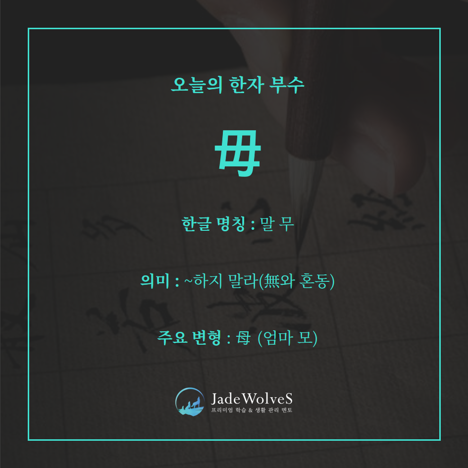 갑골문에서 아이를 안고 젖먹이는 여인의 모습에서 유래하여 입과 가슴이 강조된 모양으로 후에 부정·금지의 뜻도 파생되었습니다.