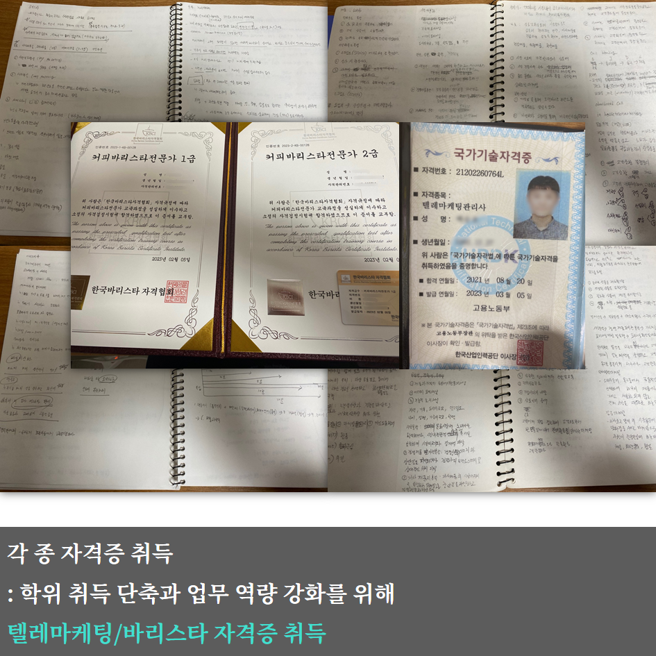 성실함이 최고의 무기인 저희 고객님은 자신에게 맞는 학습법을 제안했습니다. 오랜 시간 공부에 손을 놓고 있었지만 끝내 자신이 원하는 자격요건을 갖춰서 텔레마케팅 관리사를 따셨습니다. 그 뒤로 바리스타는 수월하게 자격증을 손에 넣으며 자신이 원하는 진로에 성큼 다가가고 계십니다.