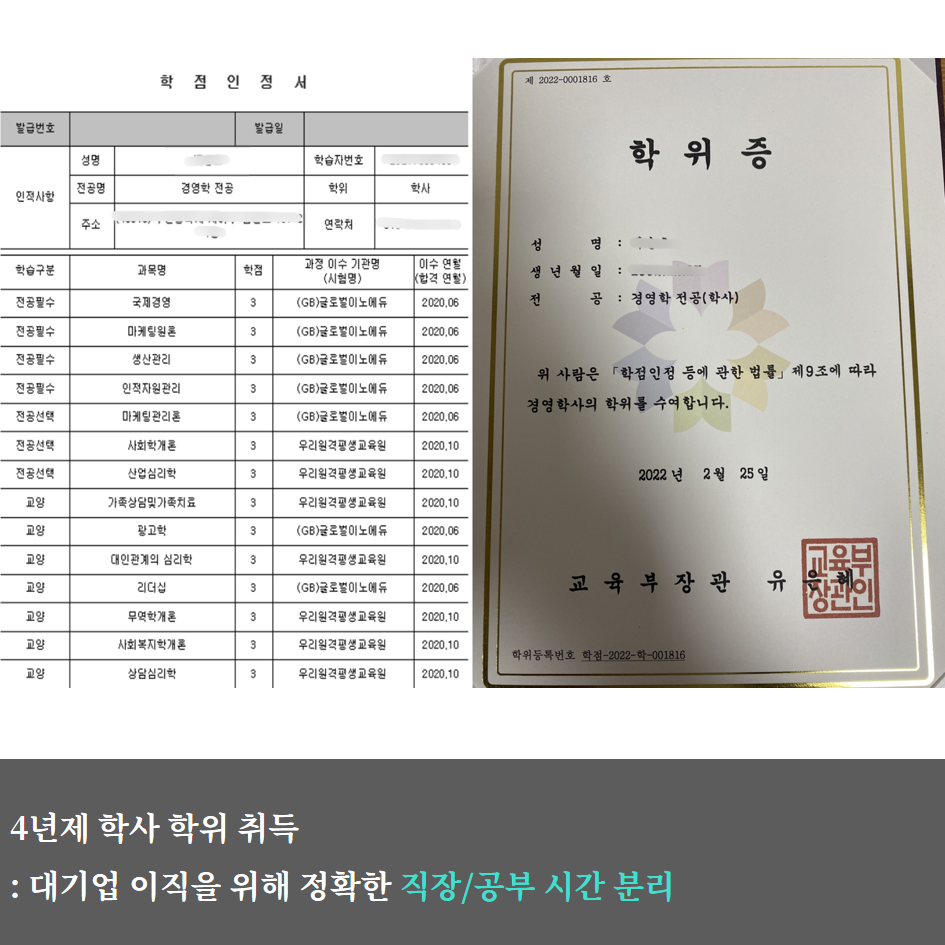 학점은행제를 통해 4년제 학위를 준비하며 취업과 미래의 진로를 제안했습니다. 일과 학업을 병행하며 시험 준비까지 고객님에게 맞춰 학습방식을 제안하고 효율적으로 공부하도록 제안했습니다.